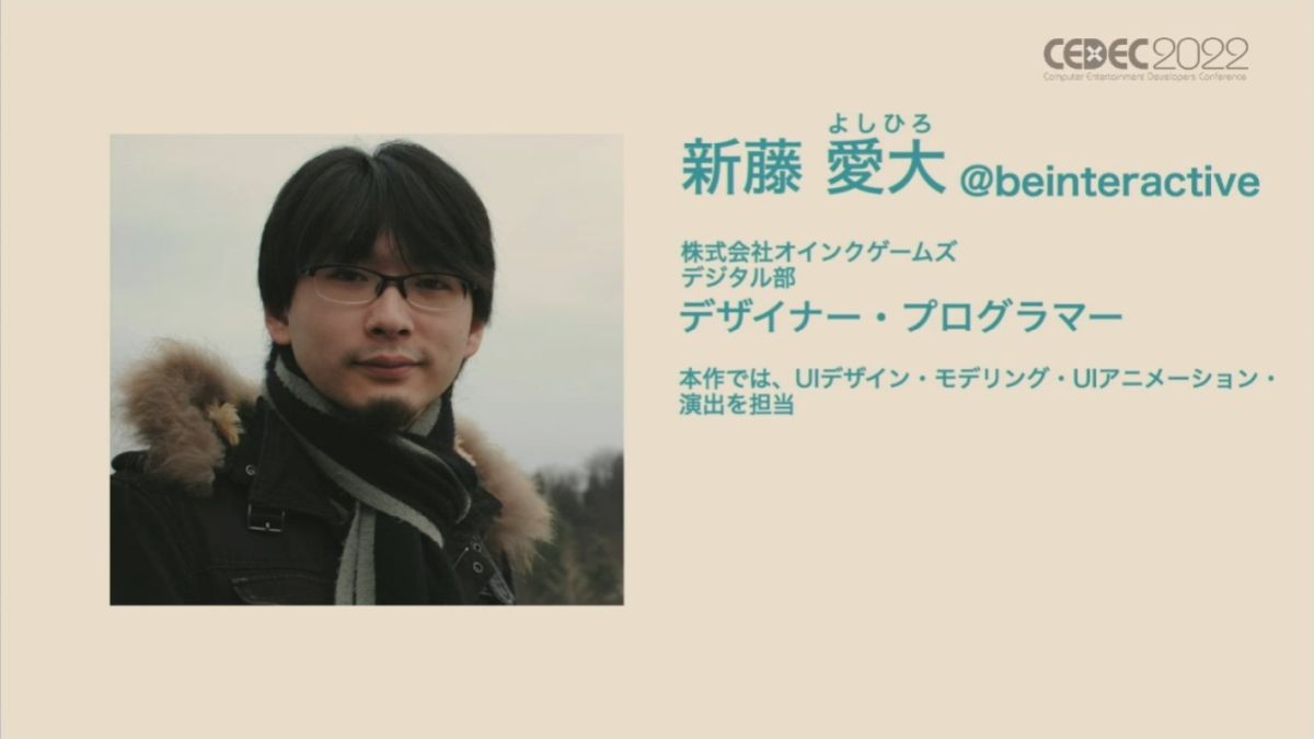 登壇したのは、オインクゲームズ デジタル部でデザイナー・プログラマーとしてデジタルゲームの開発に携わっている新藤 愛大氏。本講演で紹介されている『レッツプレイ!オインクゲームズ』では、UIデザイン・モデリング・UIアニメーション・演出を担当しています。