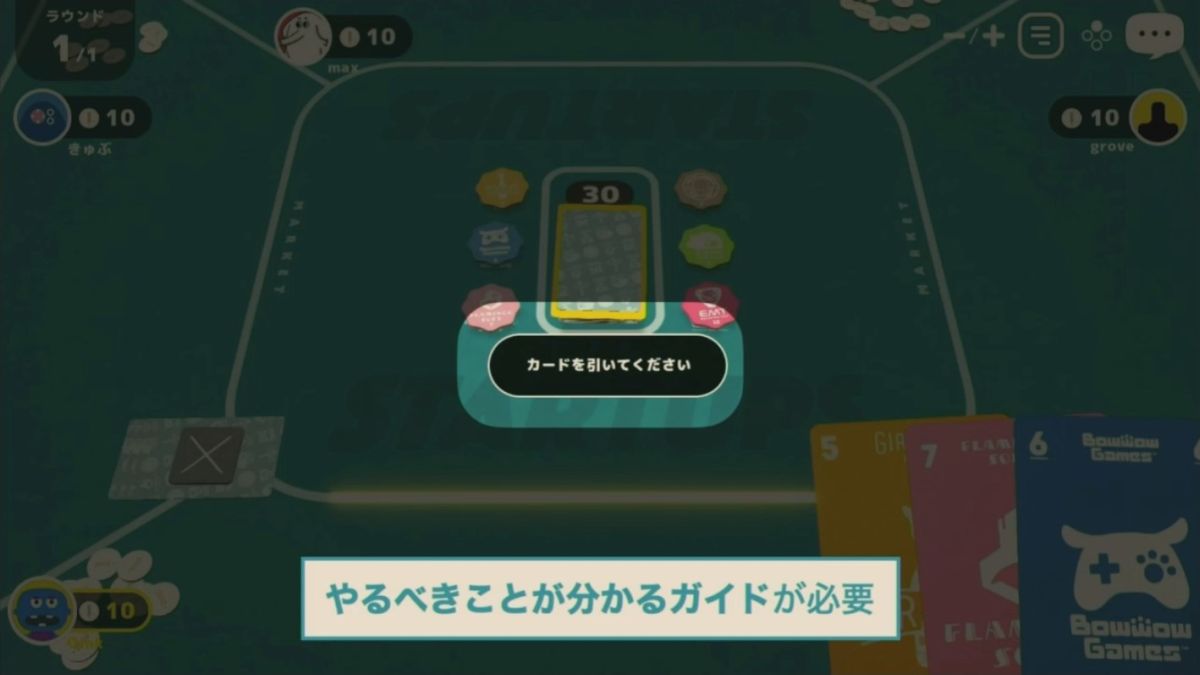 デジタル化されたボードゲームの場合、アクションゲームなどと違ってプレイヤーが常に操作する状態ではありません。このことから、「今やるべきことを示すガイドが必要」ということが分かりました。