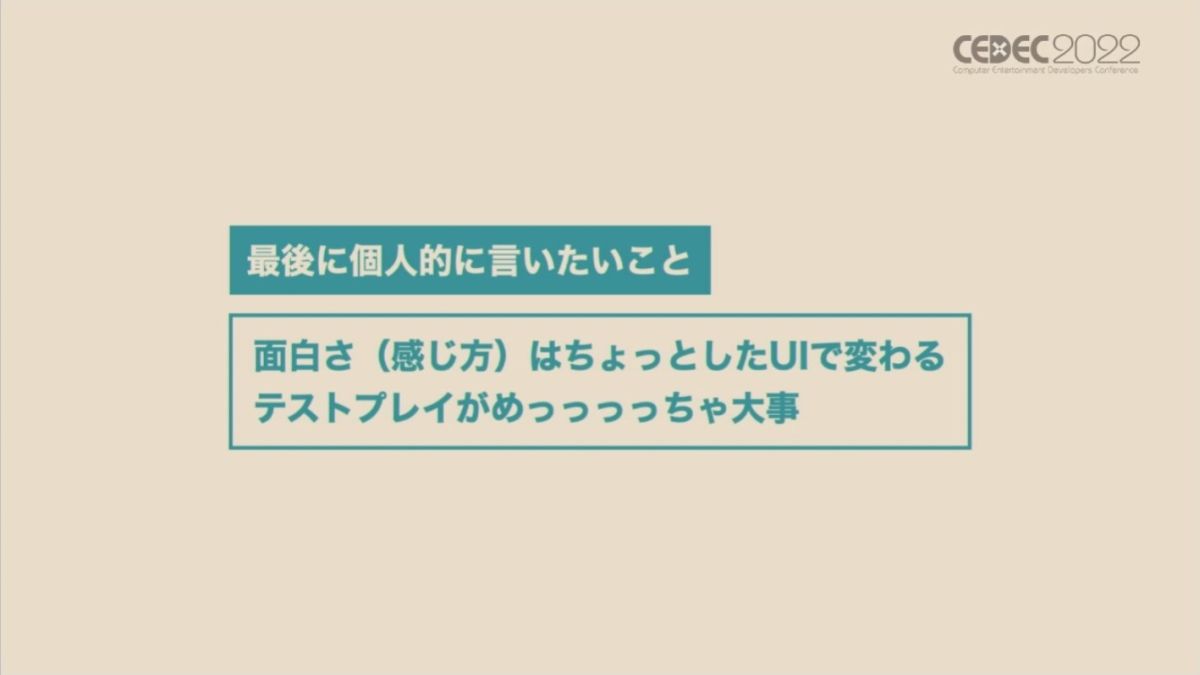 元のボードゲームの面白さを知っているからこそ、「UIデザインでこのゲームをさらに面白く感じさせられるのではないか」と常に意識すべきだと改めて感じたとのことです。これを実践するためには、頭の中で考えるだけではなく、試行錯誤を繰り返し、何度もテストプレイすることが非常に重要だと語り、講演を締めくくりました。