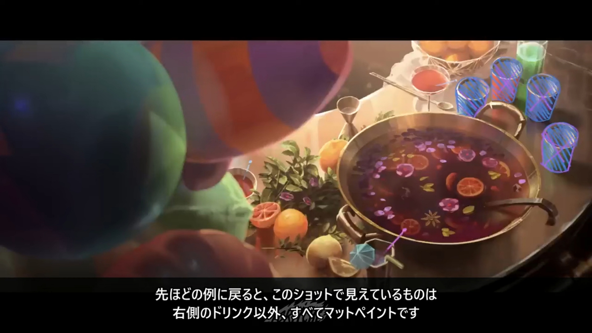 キャラクターが触る複数のグラス部分(画像右上)以外は、すべてマットペイントで制作されている(画像はYouTube動画のスクリーンショット)