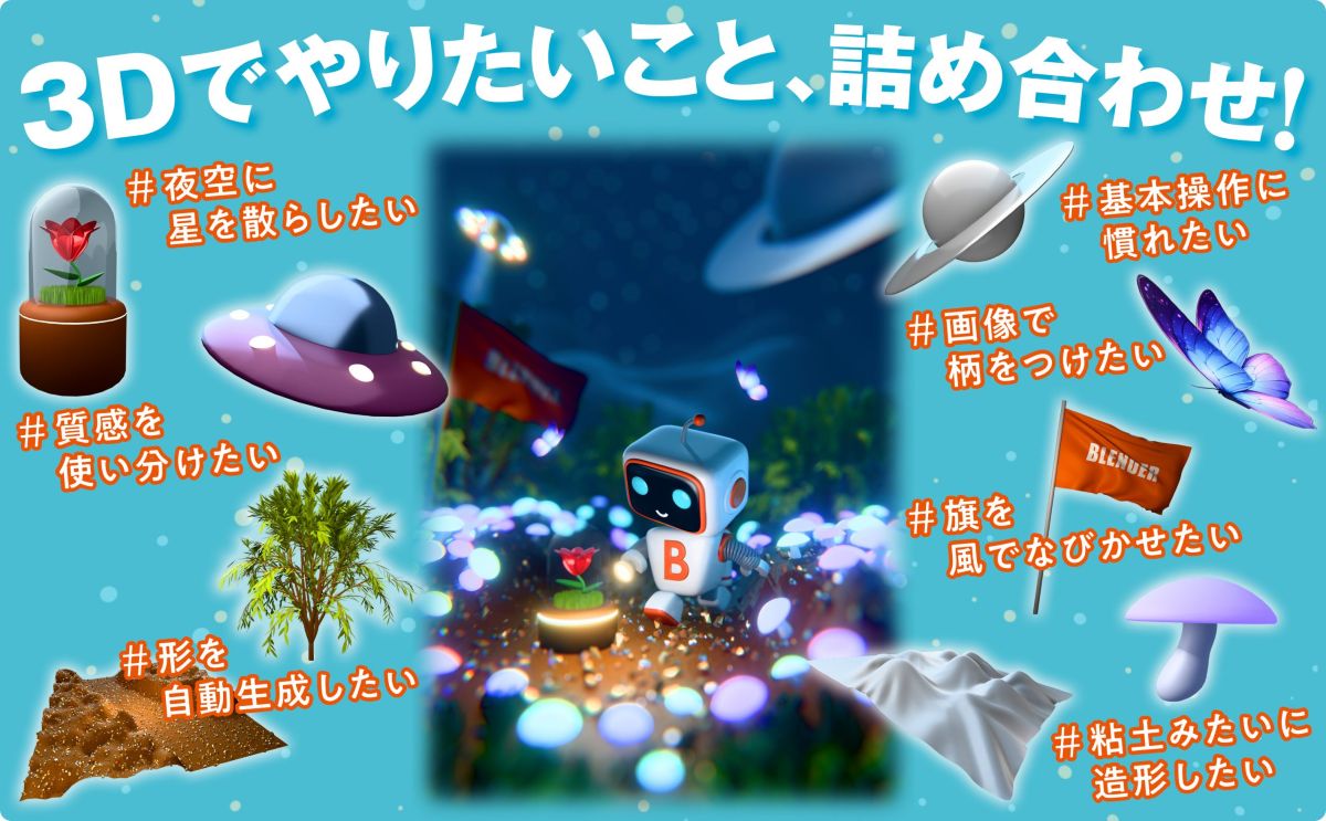 - Blenderの基本操作から、モデリング方法、シェーディングの設定方法などを学習できる