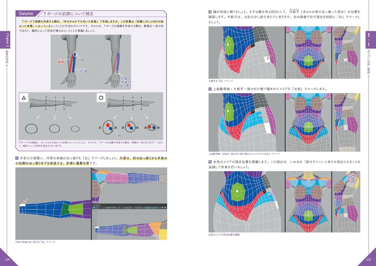 メッシュを骨格・筋肉・脂肪など部位ごとに色分けした参考画像が掲載されており、モデリングの要点を視覚的に把握しながら作業可能。また、デザイン画をもとに衣服を3Dで表現するコツや、モデルの質感・陰影などを決定付けるシェーダー設定の技法などを学習できます。