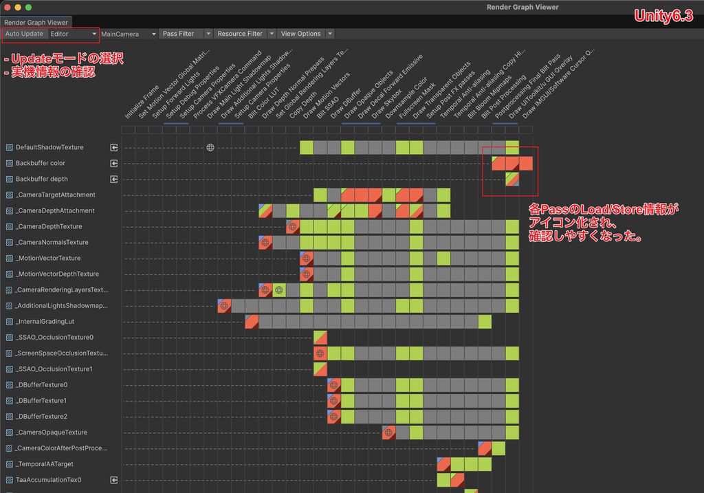 デバイス接続によってRenderGraphの動作状況をリアルタイムに監視できるようになったほか、リソースのLoad・Storeアクションが色分けされたアイコンで可視化されるようになり、レンダリングパスの挙動をより直感的に把握できるようになっています。