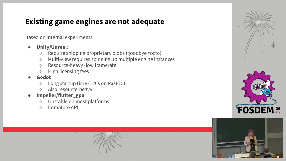 講演によると、同社ではすでにFlutterを用いた車載システムを実用化していましたが、従来の仕組みでは2Dの静的なインターフェースしか実装できず、3Dによる表現力に制約があったといいます。