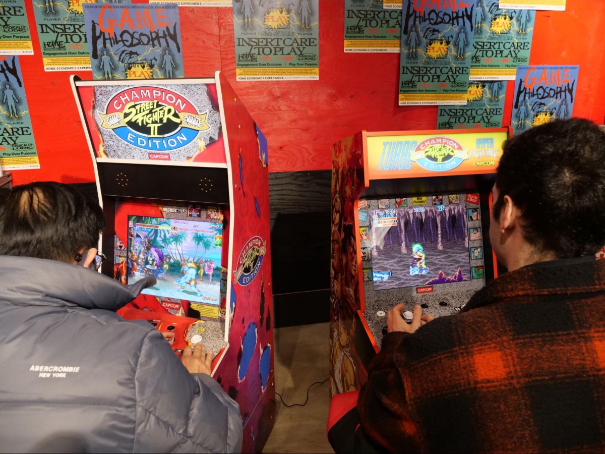 展示作品の一部は実際にプレイも可能。1991年、ゲームセンターで一世を風靡した『ストリートファイターⅡ』アーケード筐体をはじめ、Atari 2600やアルカディア(Arcadia)などの貴重な家庭用ゲームハードも自由に遊べる状態で丸テーブルに置かれており、周辺は大いに盛り上がっていました。