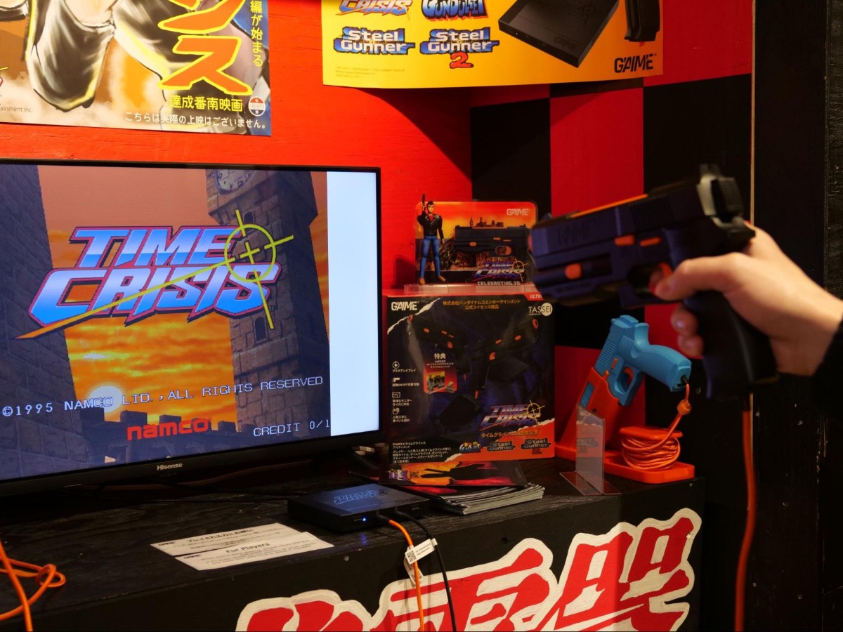 懐かしのシューティングゲーム『タイムクライシス』を、達成電器のプラグ&プレイ式ガンコントローラー「G’AIM’E」(ジーエイム)でプレイ。