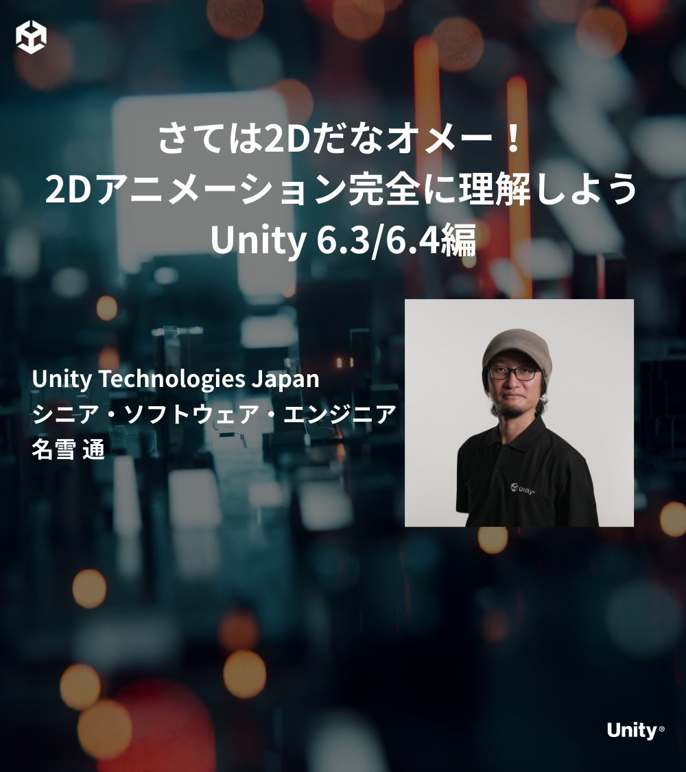 前半パートでは、同社所属のシニア・ソフトウェア・エンジニア 名雪 通氏が登壇し『さては2Dだなオメー!2Dアニメーション完全に理解しよう Unity 6.3/6.4編』と題した講演が実施されました。