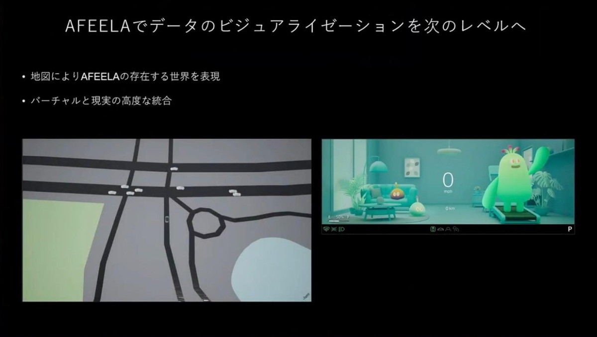現実世界のデータとの統合 『AFEELA 1』は、現実世界のセンサーデータや認識データを3Dマップ上に統合表示することが可能です。