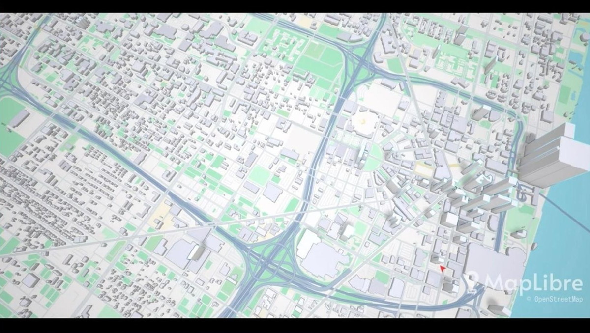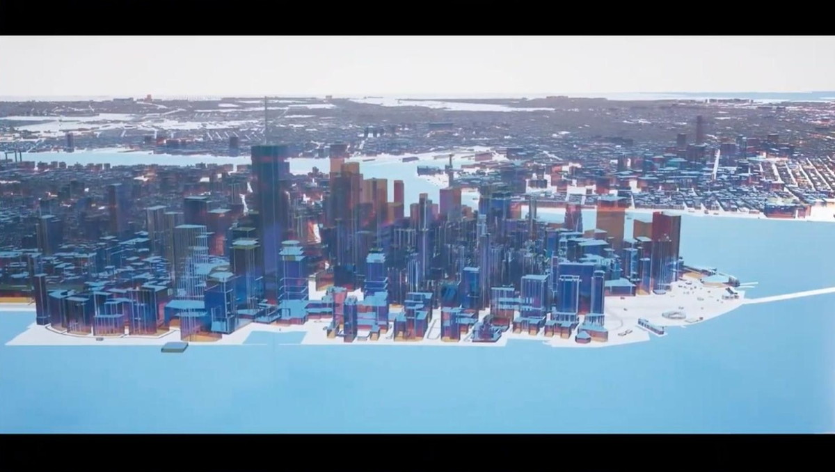 マンハッタンのフライスルー映像では、3Dで生成された建物やベクターレンダリングされた道路が表示され、夜景から昼間のスタイルへシームレスに遷移する様子が示されました。