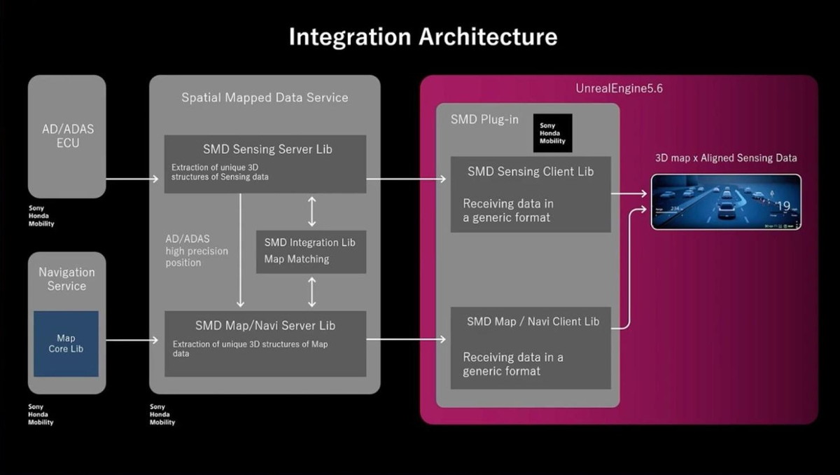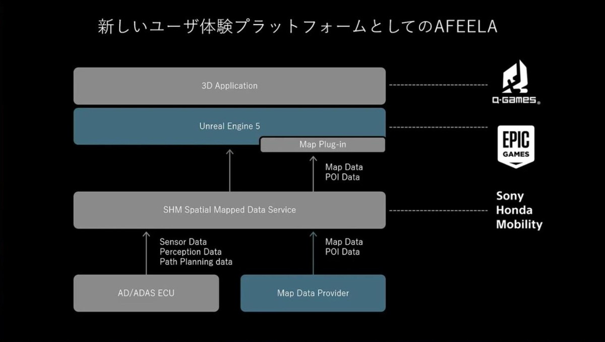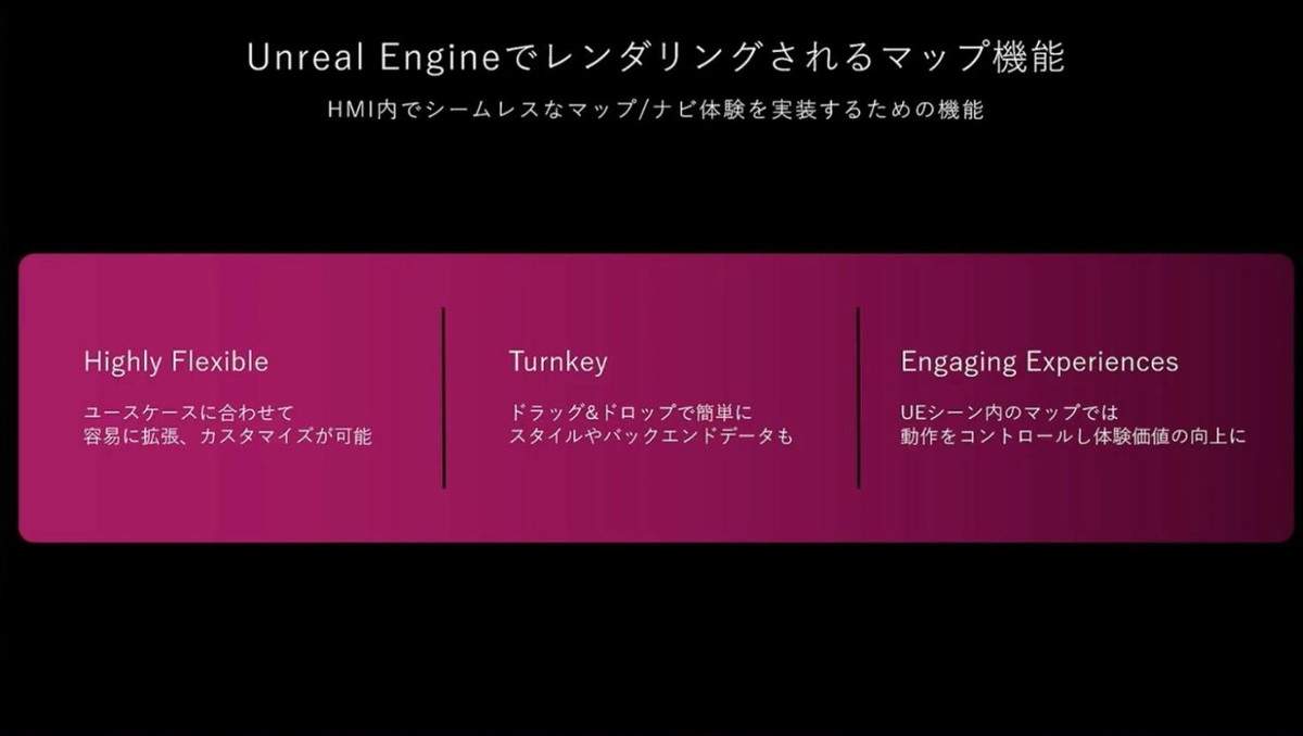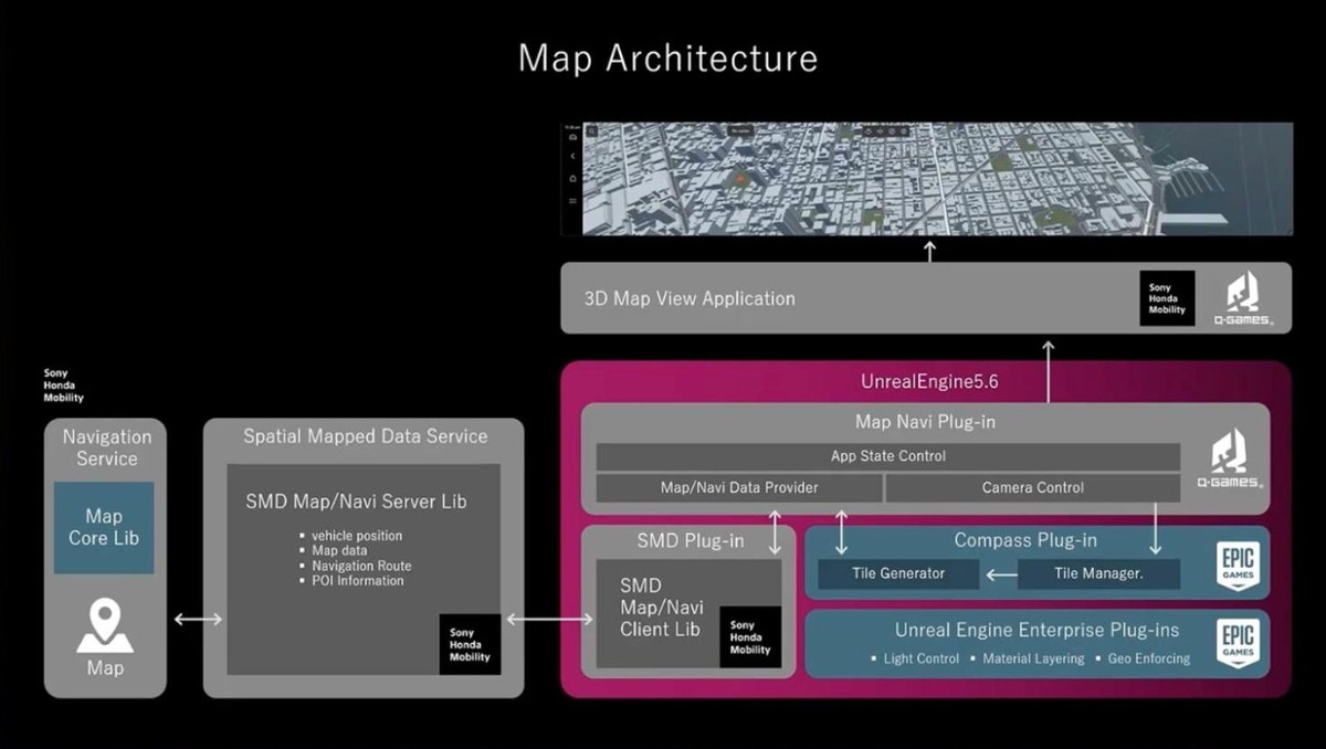 Epic Gamesの役割 様々なプロバイダーのニーズに対応し、サポートを考慮したマップレンダリングのためのコアプラグインを開発。今回の協業により、『AFEELA 1』のサポートも可能になりました。