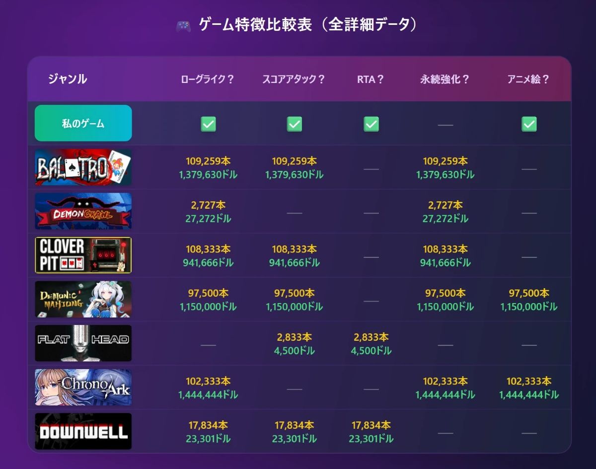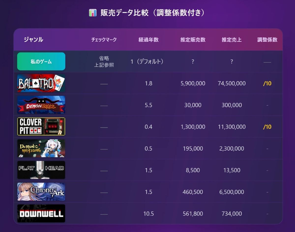 『Balatro』や『Demoncrawl』など複数のタイトルを挙げ、推定売上高や販売本数、発売日からの経過年数をまとめた表。