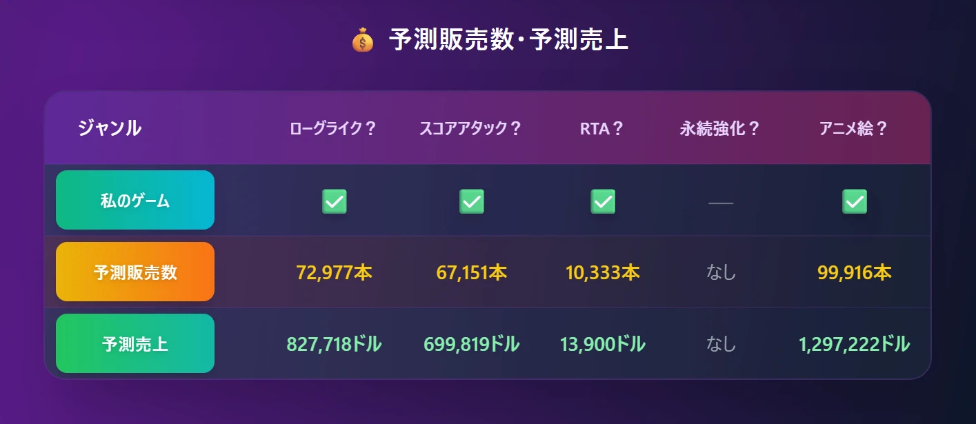 - 自作品に類似する既存ゲームの売上や販売本数をもとに、自作品の予測売上・販売本数を求める手順などを語っている
