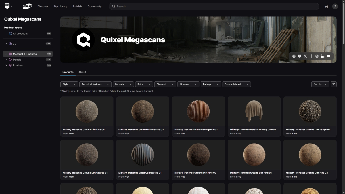 Quixel Megascansでは、マテリアルやテクスチャを合計10,000以上提供中(画像は「Fab」ストアページよりスクリーンショット)