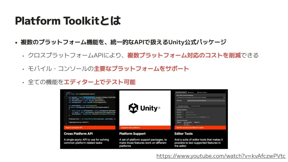 「プラットフォーム ツールキット入門」では、各プラットフォーム固有のシステムやサービスにアクセスする仕組みなどを、単一のAPIで一元的に取り扱えるUnity公式パッケージ「Platform Toolkit」の基礎について、サイバーエージェントのエンジニア「ゆっち〜」氏こと向井 祐一郎氏が解説した(画像はスライド資料より引用)