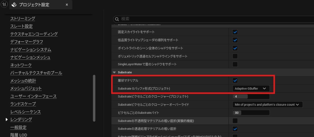 利用にあたっては、プロジェクト設定で「Substrate」と「Adaptive GBuffer」を有効にする必要があります。