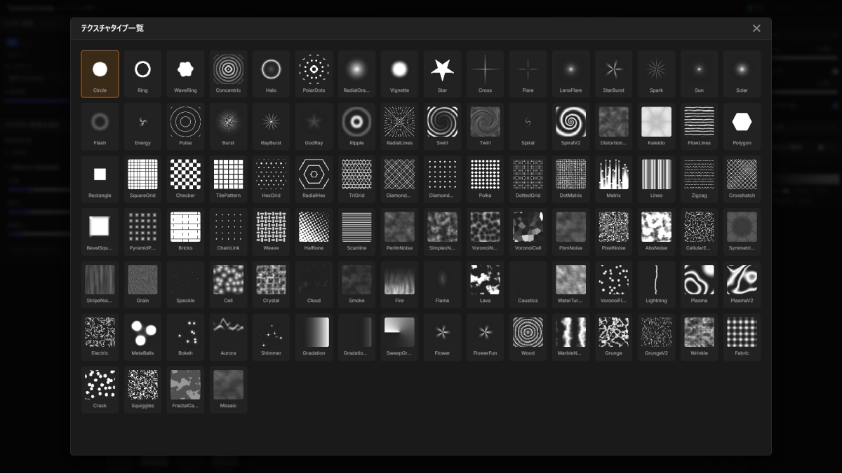 記事執筆時点で利用できるテクスチャパターン一覧。レイヤー機能も搭載しており、複数パターンから1枚のテクスチャを生成することも可能(画像は「TextureCreate」のスクリーンショット)