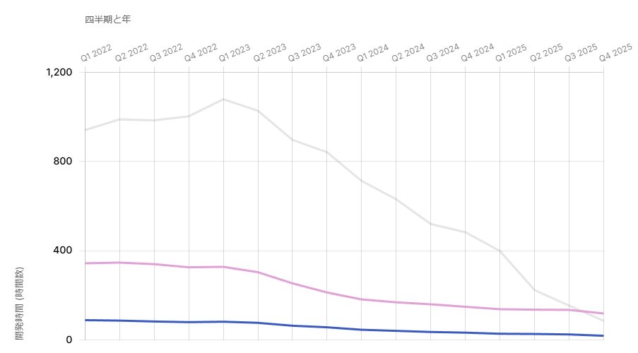 開発時間の中央値を調査すると、2022年1月当時は月間91時間であったのに対し、2025年12月には77%減の月間21時間まで減少。なお、MAU(※)が100万以上のプロジェクトに関しては、2023年3月の月間462時間をピークに、2025年10月には月間86時間まで減少しています。