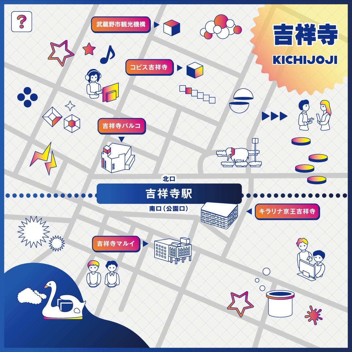 スタンプ配置スポットは、吉祥寺マルイ、キラリナ京王吉祥寺、コピス吉祥寺、吉祥寺PARCO、武蔵野市観光機構事務局(武蔵野商工会館)の5か所。
