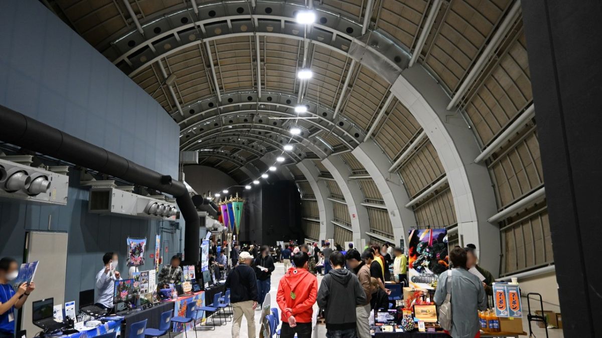 今回使用された「スカイホール」は京セラドーム大阪9階のイベント会場とあって、野球場のコンコースを思わせるドーナツ状の空間。そのため、インディーゲーム展示会としては非常に珍しい「入り口から最奥部まで一本道」の会場で、左右にさまざまブースが待ち受ける配置となっていました。