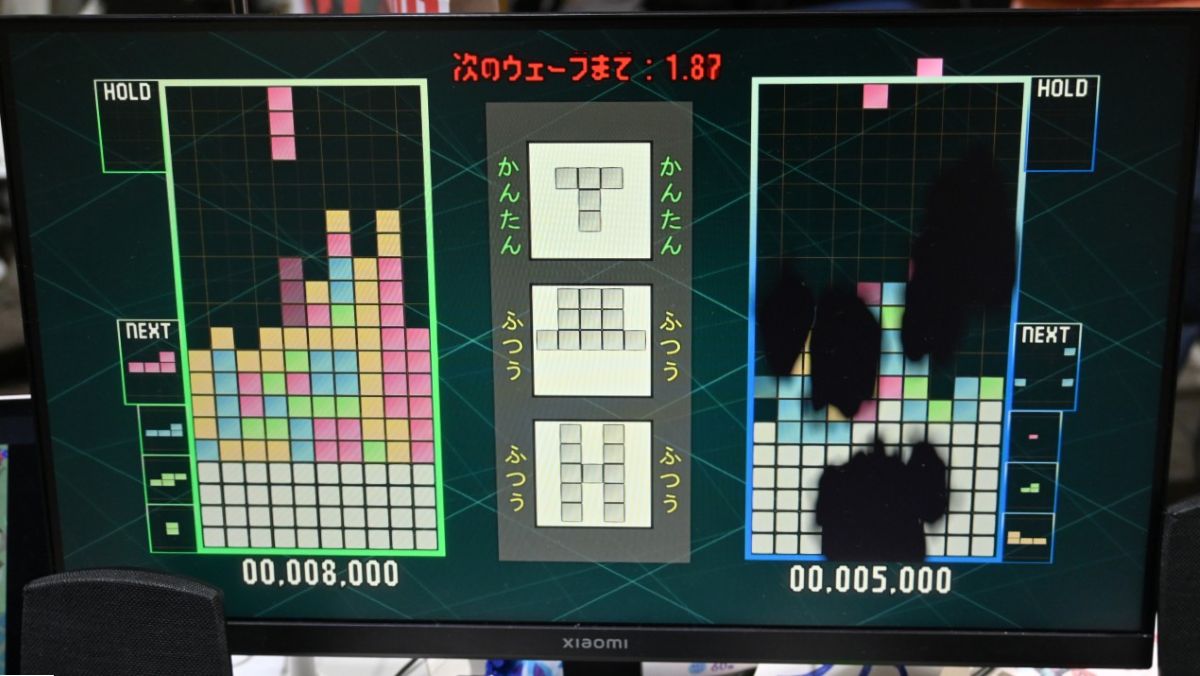 右プレイヤーの画面に妨害が発生中。盤面の一部が黒く塗り潰され、視界が封じられている