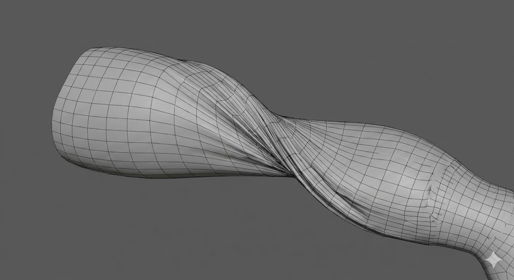 実際の人間は、肘関節から前腕部を回転させることができますが、いま示したような超シンプルなリニアボーンスキニングでは、肘関節周囲にポリゴンのねじれとつぶれが起きてしまう「キャンディラッパー現象」が発生してしまいます。