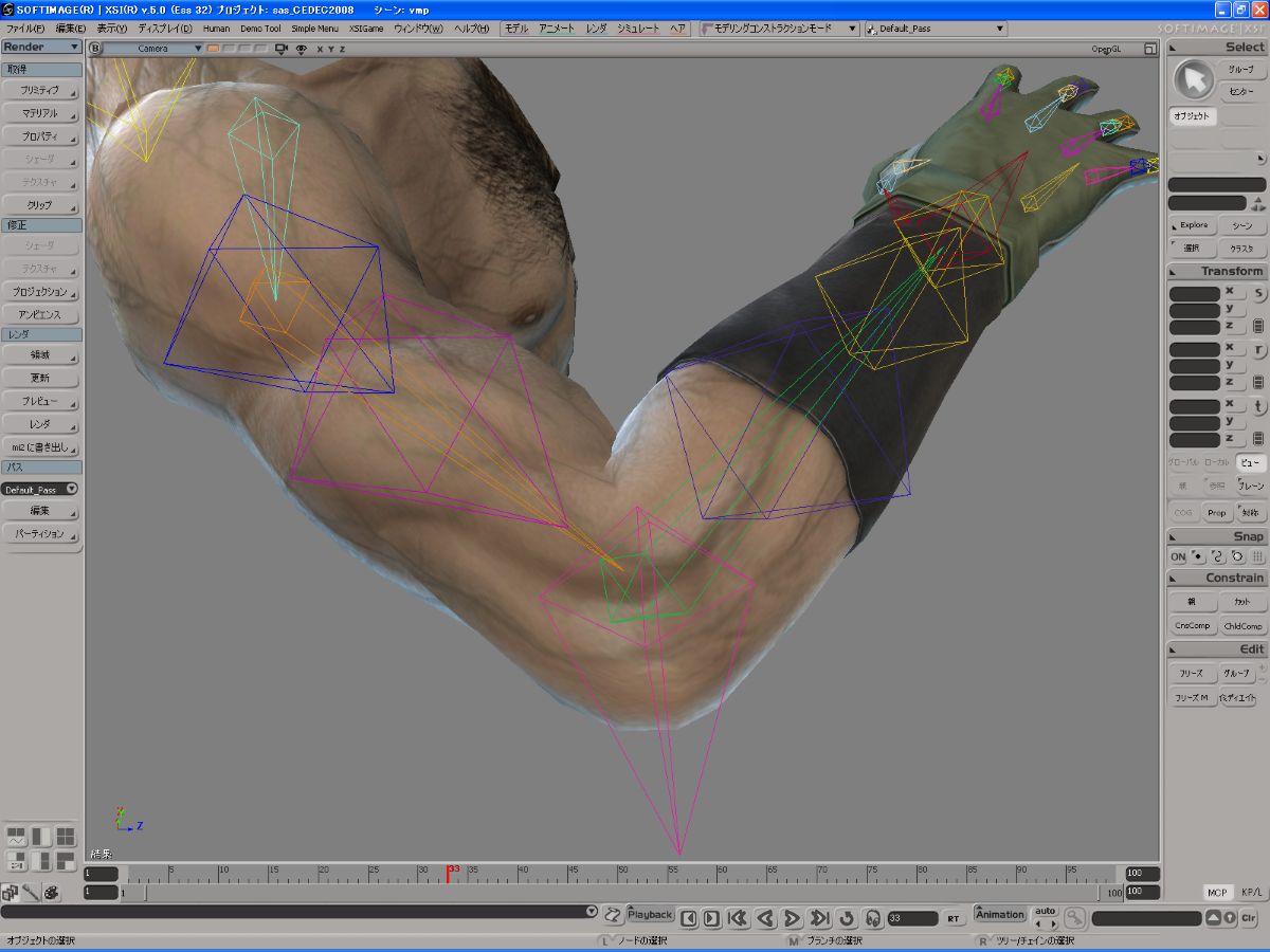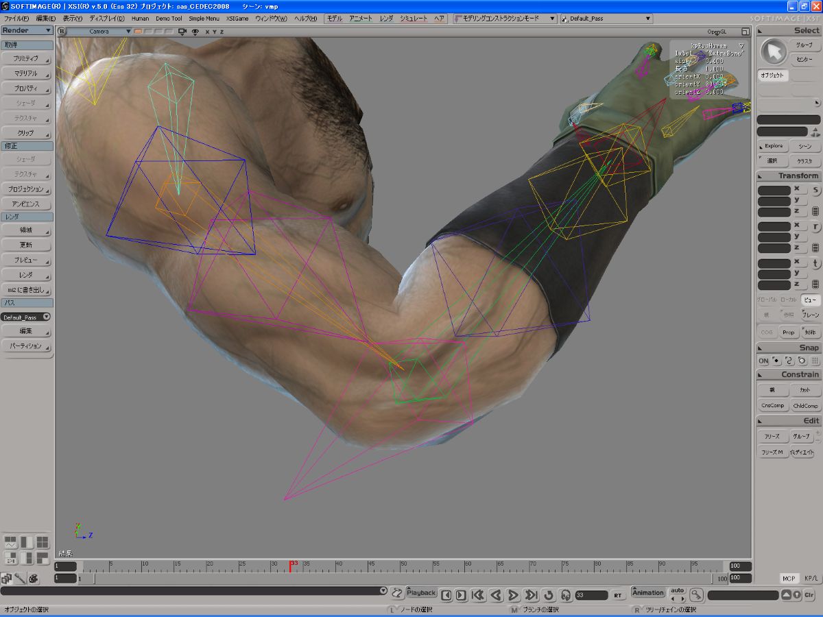 PS3版『メタルギアソリッド4 ガンズ・オブ・ザ・パトリオット』より。主人公スネークの腕の曲がりを本物の人体らしく曲げるために肘関節に補助ボーンを仕込んでいた。画像は開発画面において、補助ボーンの影響をオン(画像左)/オフ(画像右)としたもの。補助ボーン自体は肘関節から飛び出しているピンク色のもの