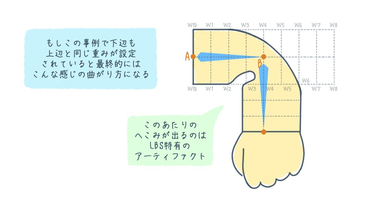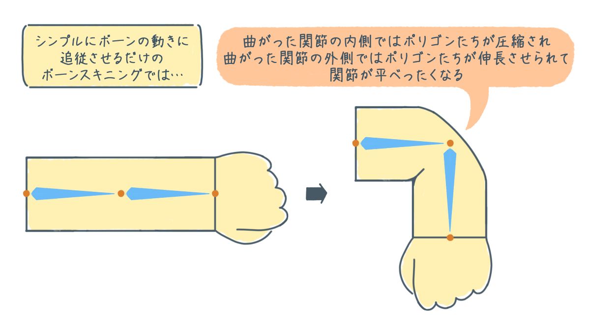 しかし、曲がった関節の内側のポリゴン達は圧縮されて縮み、逆に外側のポリゴン達は引き延ばされて肘に相当る部分が凹んだように描画されることになります。内骨格の生き物としては奇妙な見映えとなってしまいます。上でも述べたへんてこな曲がり方ですね。