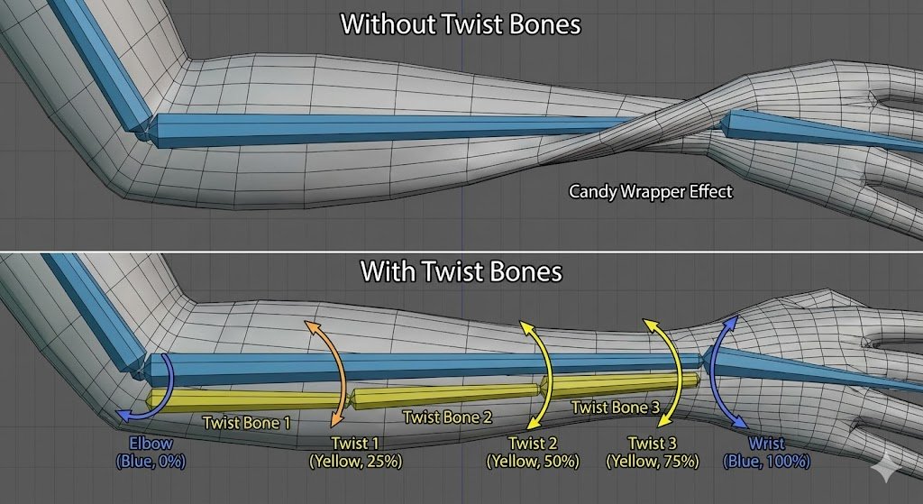 本稿では詳しくは追いませんが、これを緩和するための最もシンプルなアプローチは「ツイストボーン」と呼ばれる、回転軸方向に複数の「補助ボーン」を入れることです。