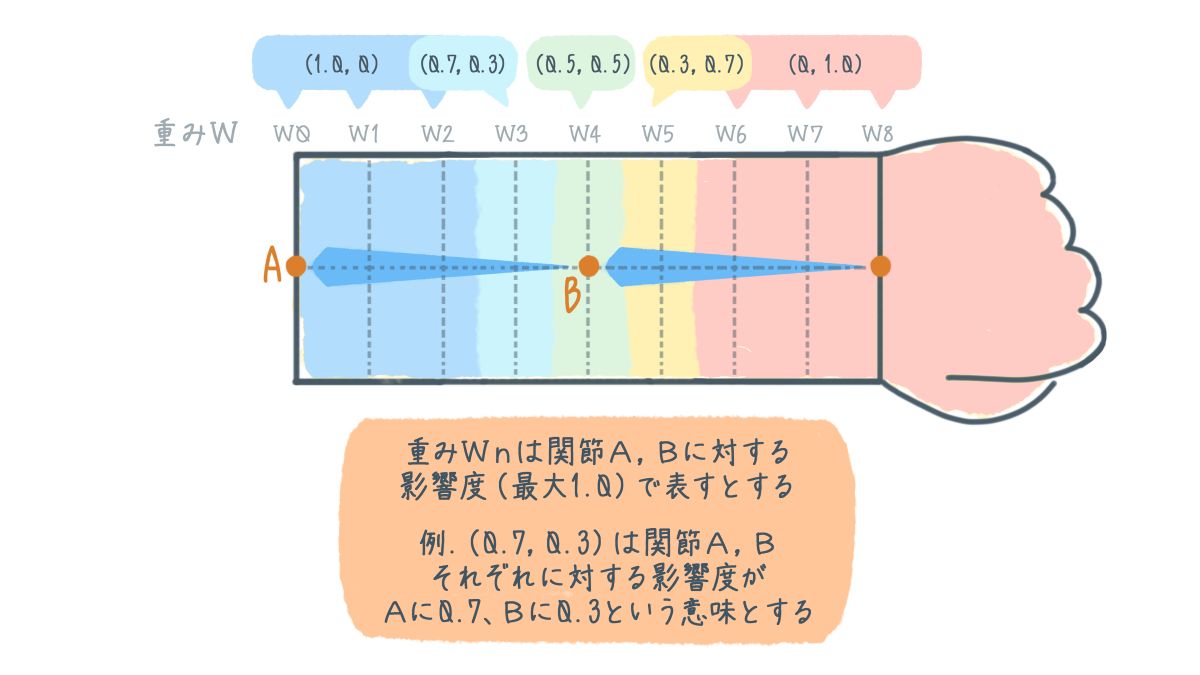 ここで、この肘関節に対して、上腕や前腕上のポリゴン達が、どの程度の影響を受けるかの「重み値」を設定してやり、重み値の大きい方向に、各部位のポリゴン達の頂点が引き寄せられるような変移を演算してやります。こうすると、先ほどとは違い、肘関節周囲のポリゴン達が体積をそれなりに維持した感じで曲がって描画されるようになります。