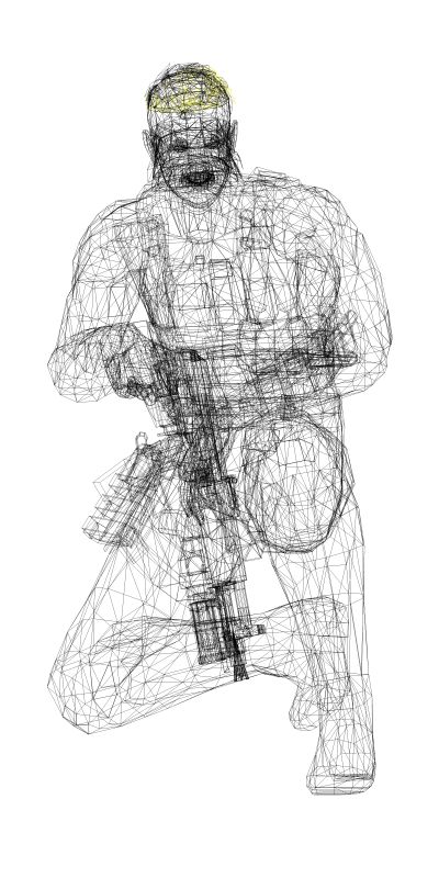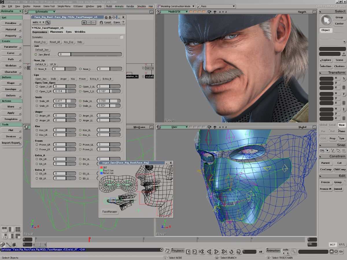 PS3版『メタルギアソリッド4 ガンズ・オブ・ザ・パトリオット』より。主人公スネークに対しては人間らしいリアルな感情表現を実現するために、顔面に対して多くのボーンが仕込まれていた。