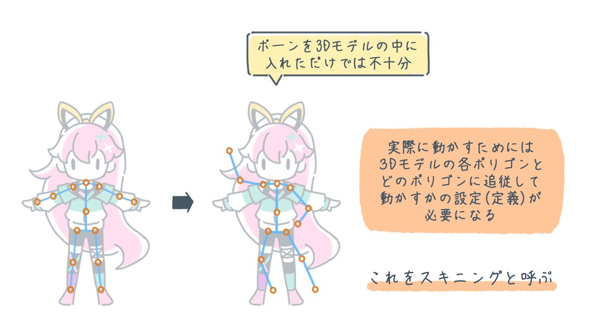 人体系3Dキャラクターの3Dモデルを内骨格的な手法で動かすには、その3Dモデルの内部に「骨」(ボーン)を仕込む必要があります。