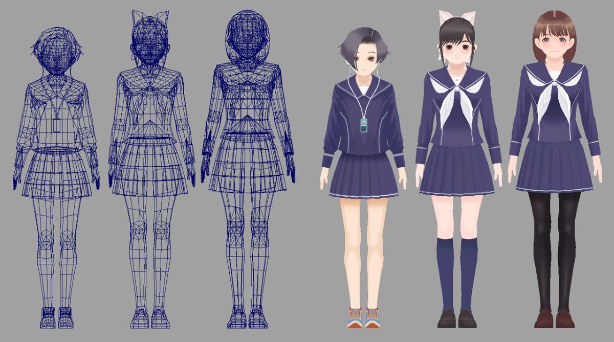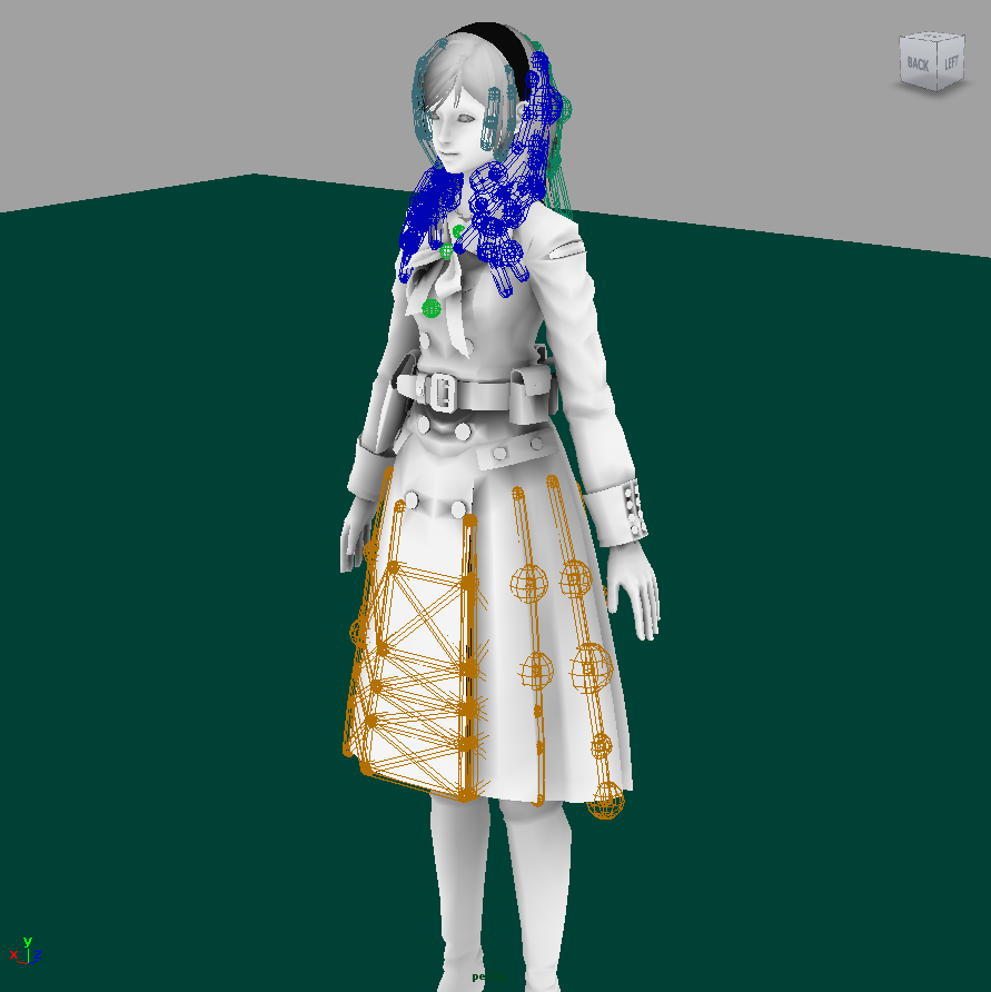 ニンテンドーDS(NDS)用『ラブプラス』より。決して3D性能が高いとはいえなかったNDSにおいて、5,000ポリゴン、総ボーン数53本でボーンスキニングを実践していた。ボーン設計は全ヒロイン共通。ヒロイン達の可愛らしい仕草を実現するため、スカートや髪、胸の補助ボーンが仕込まれていた