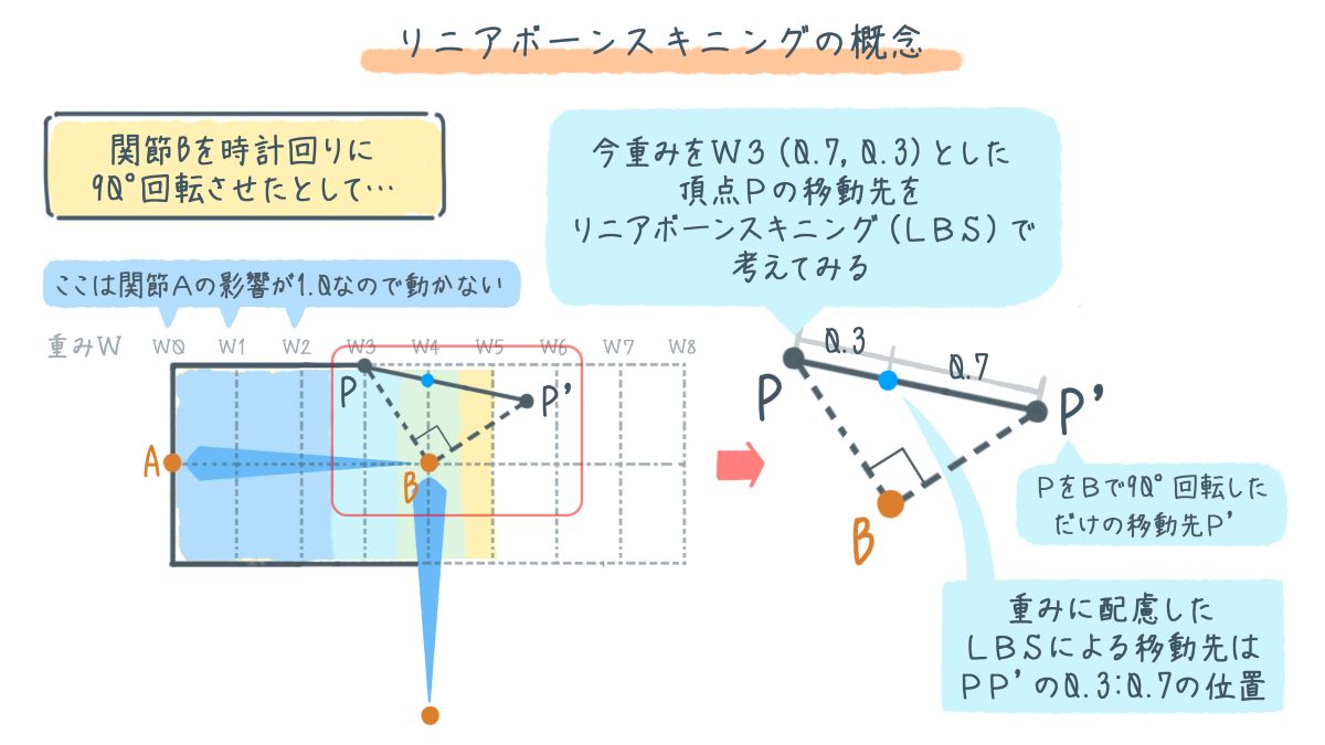 この変移量がシンプルな線形演算で実践されることから「リニア・ボーン・スキニング」(Linear Bone Skinning)とか「リニア・ブレンド・スキニング」(Linear Blend Skinning)と呼ばれます。両方とも略語はLBSとなります。プログラマブルシェーダーが出始めの頃の2000年代初頭は「頂点ブレンディング」とも呼ばれていました。