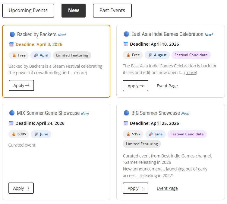 世界各地で開催されるオフラインイベントや、ライブ配信形式のショーケース、Steamイベントなどについて、開催月や出展申込締切、出展料などの情報や、イベント公式サイトなどのリンクを掲載しています。
