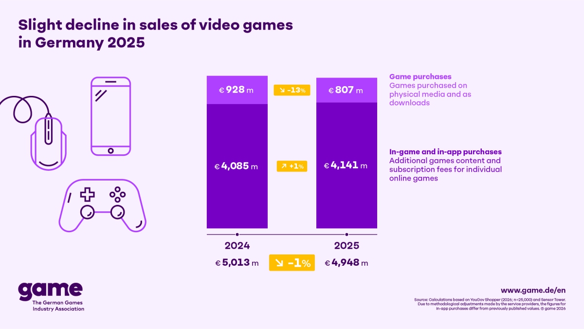 ゲーム本体およびアプリ内課金による売上総額は、前年比1%減の49億ユーロとわずかに縮小傾向を見せました。