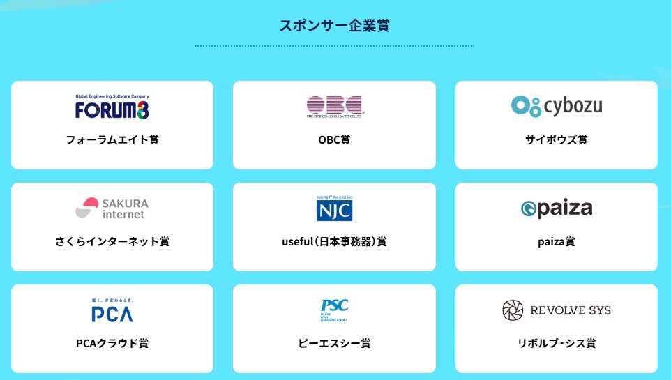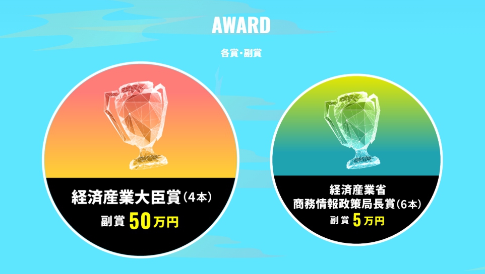 表彰区分は、経済産業大臣賞(副賞:50万円)が4本、経済産業省商務情報政策局長賞(副賞:5万円)が6本、そのほかスポンサー企業賞などが用意されています。