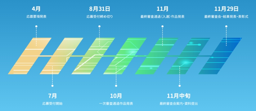 審査は事前審査・一次審査・最終審査の3回にわたって行われます。総合的な獲得点数に基づく評価に加え、「プロダクト」「テクノロジー」「アイデア」という3つの評価軸から優秀作品が選出されます。