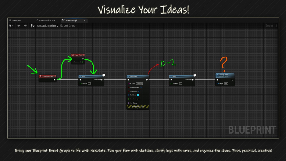 UEのブループリントエディタ上に、文字や図形などを直接書き込めるプラグインです。ペンの太さやカラーは自由に変更可能。付せん形式でメモを貼り付ける機能も搭載しています。