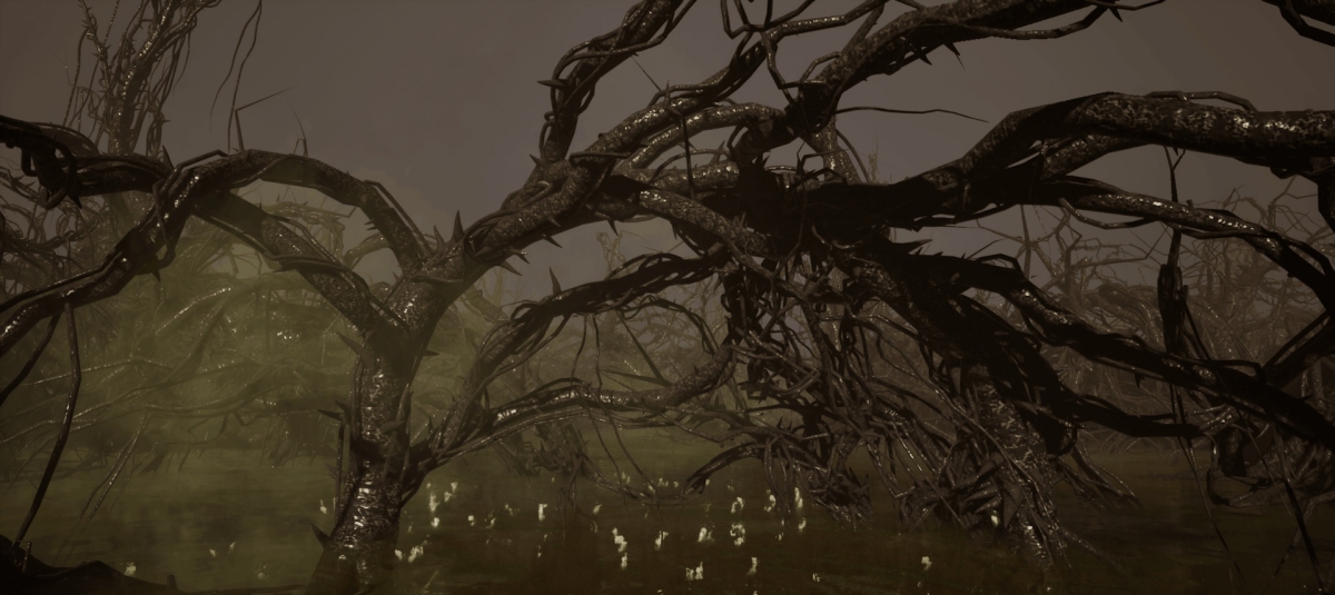 茨の巻き付いた樹木が生い茂る、不気味な森の環境アセットです。樹木や石、茂みといった合計18のメッシュのほか、炎や煙のエフェクトなどが用意されています。