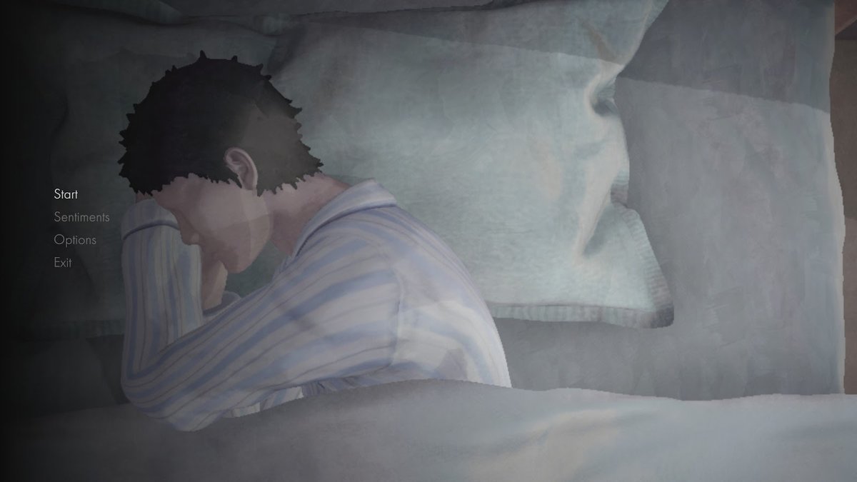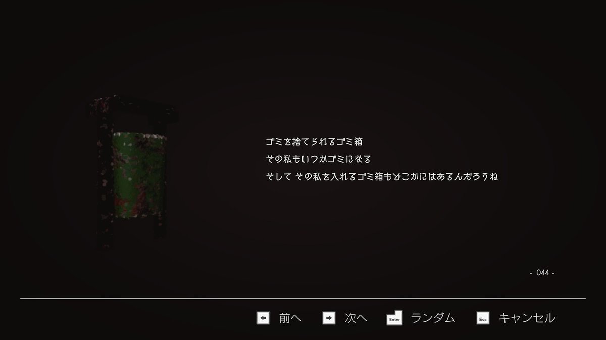 モノと話して集めたセリフは「Sentiments」に本のように集まっていくようになっていて、ベッドのシーンのメニューからすべて見られるようになっています。それをただ眺めながら、ぼーっとしてもらうのもいいと思います。