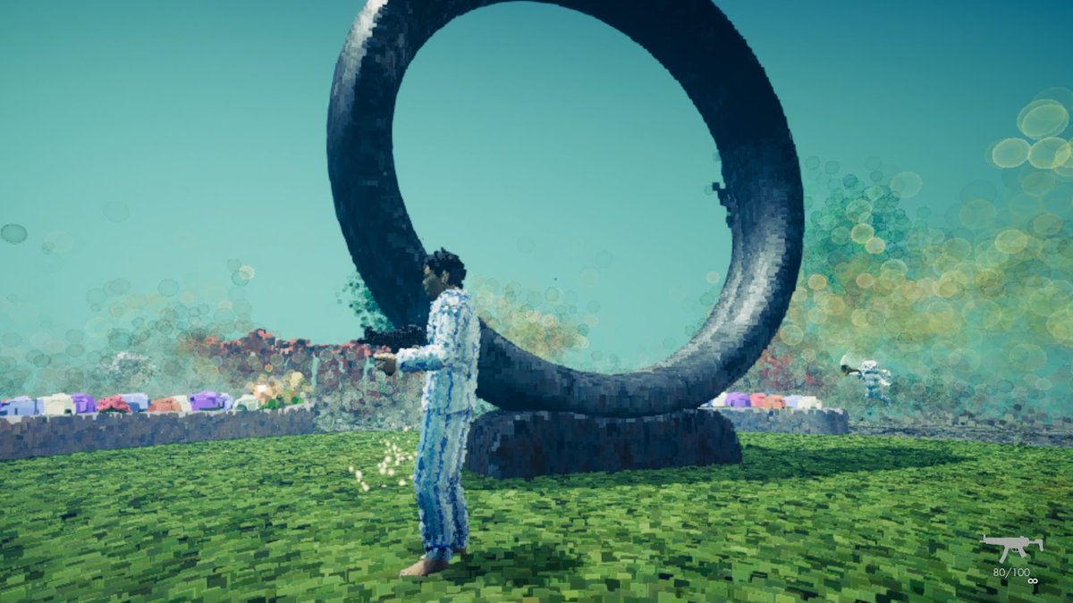 ポイントクラウドで表現された、ぼやけた世界を銃で撃つ。少しずつ具体化され、世界が現れるという斬新なシステムは、まさに技術先行で生まれたゲームデザインと言える