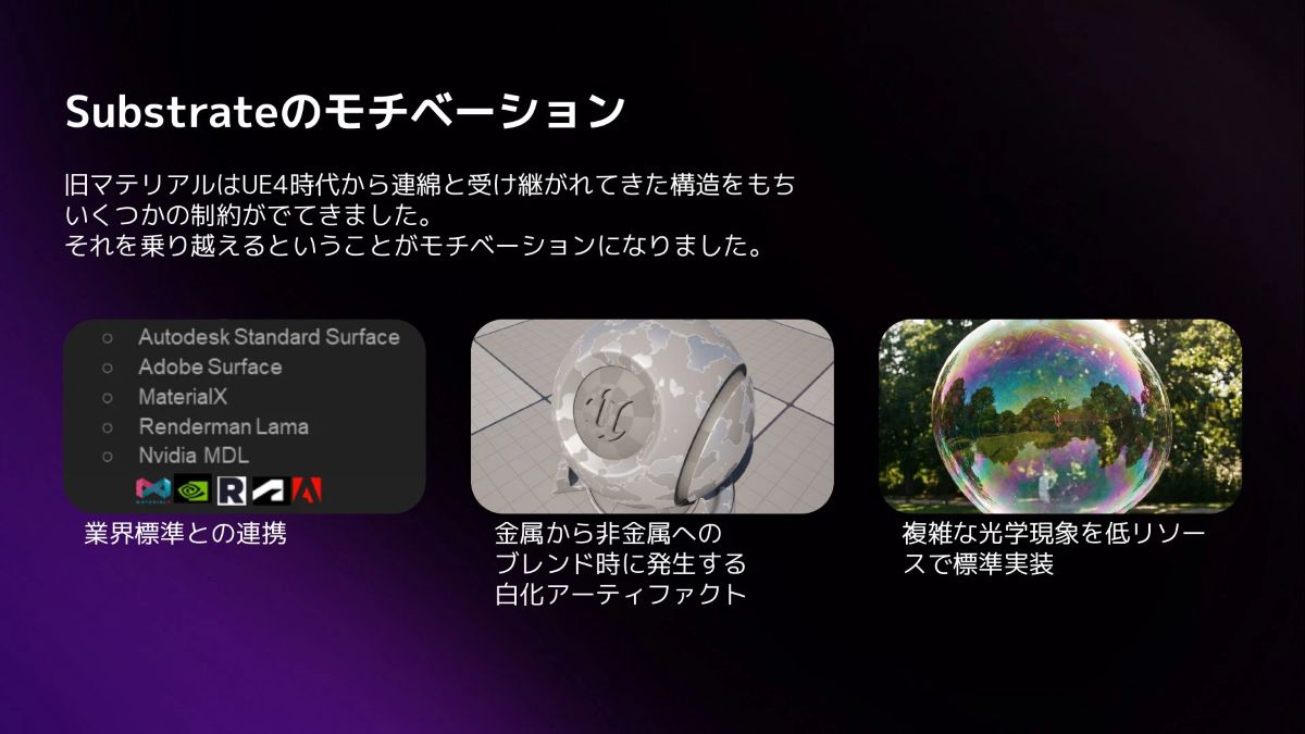 「UE5の新標準マテリアルシステムSubstrateの内部構造とパフォーマンス」は、Unreal Engine 5.7より標準化されたマテリアルシステム「Substrate」について、旧来機能との互換性や動作の違いなどを解説しています(以下、Unreal EngineはUEと表記)。