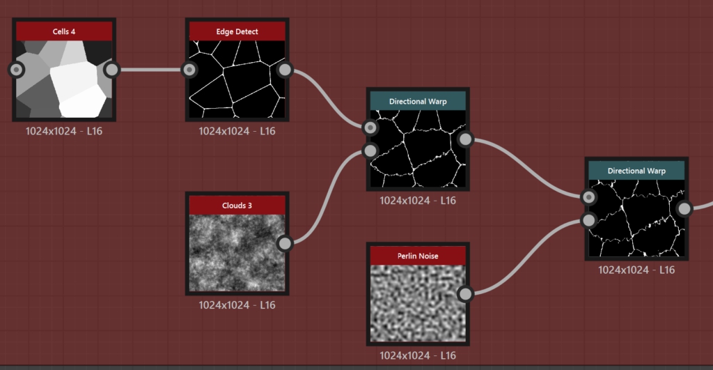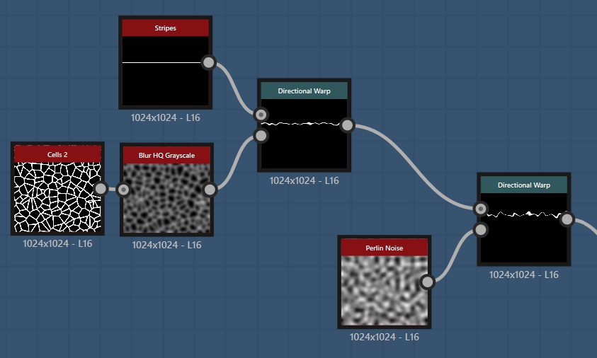 まずは「Stripes」を用いて一筋のラインを作り、「Cells 2」および「Blur HQ Grayscale」で生成した幾何学パターンをもとにDirectional Warpで歪ませます。