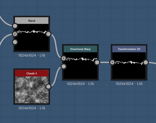 それらを「Blend」にて合成し、「Clouds 3」のパターンを用いた歪みの追加、「Transformation 2D」による位置調整を行うことでメインとなる歪んだラインが完成します。