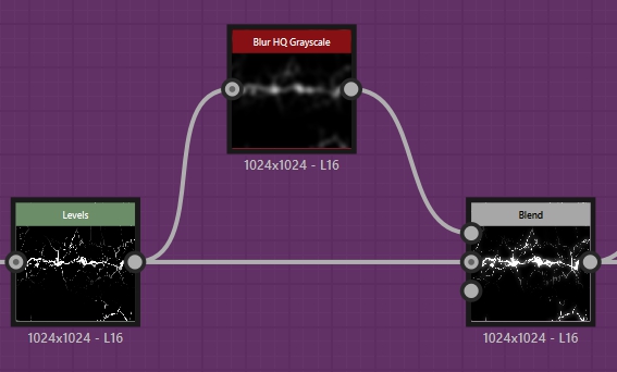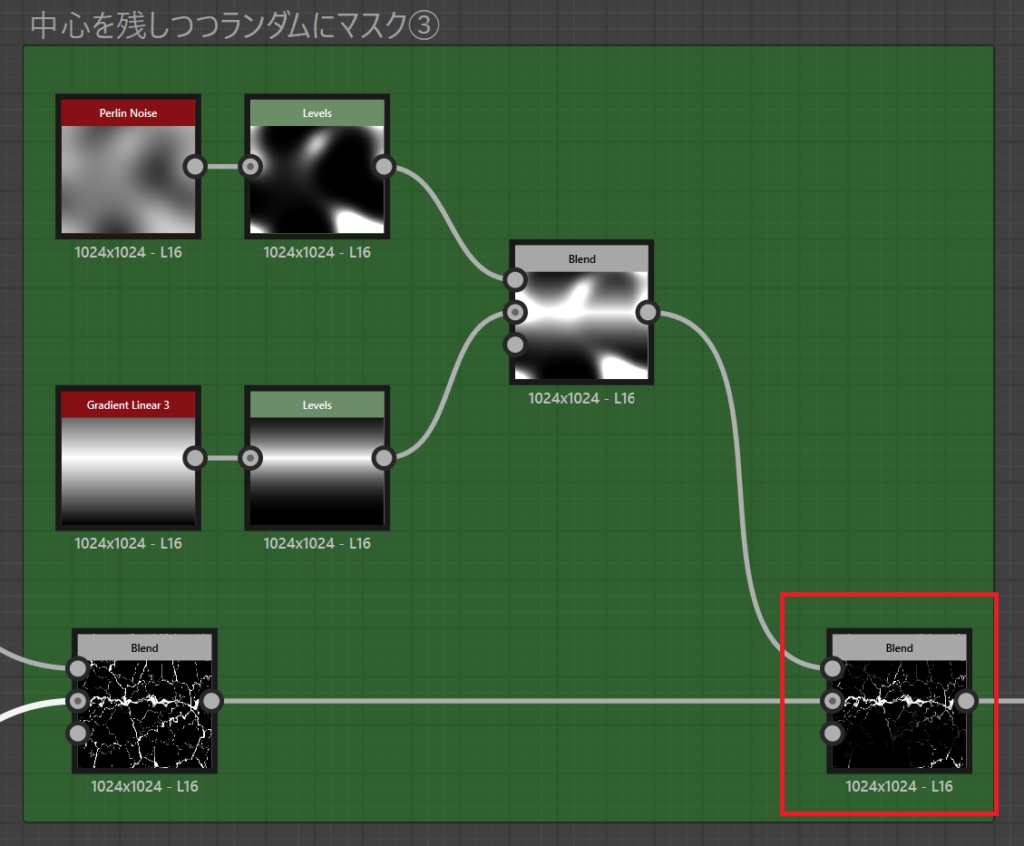 これらを「Blend」に繋げて合成したら、「Perlin Noise」などを使ってランダムなマスクを生成。