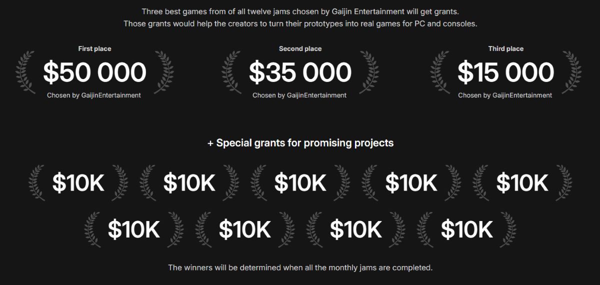 本ゲームジャムは年間を通して実施される予定で、毎月「Best Game」と「Community Choice」に選出されたタイトルを対象に年間で優秀だった作品が表彰され、1位には50,000ドル、2位には35,000ドル、3位には15,000ドルが授与されます。