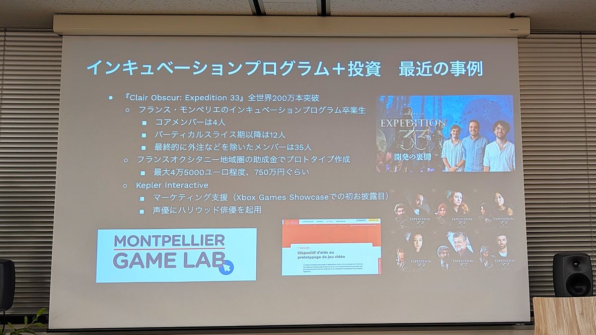海外ゲームタイトルにおけるインキュベーション施策・助成金活用の事例として、フランスの開発チームによるターン制RPG『Clair Obscur: Expedition 33』が紹介された