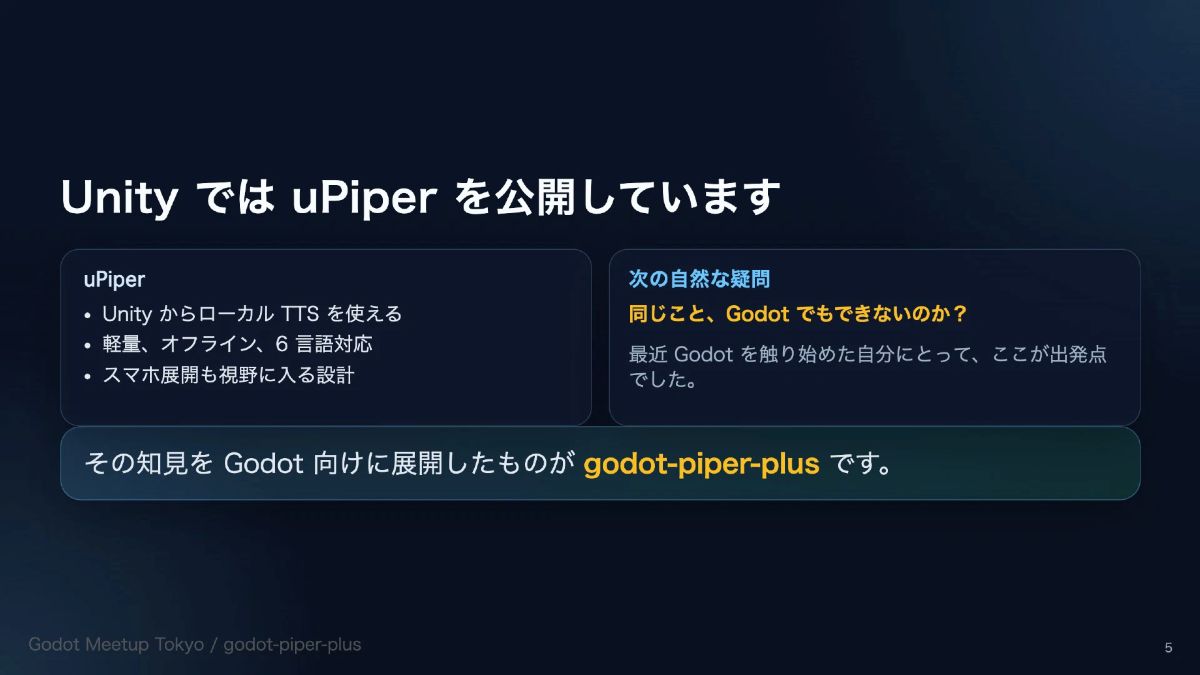 「GodotでローカルTTSを使うためのアドオンを作ってみた」では、Unity用のオープンソースTTSプラグイン「uPiper」をもとに開発が進められている、Godot Engineで合成音声を使用できるアドオン「godot-piper-plus」について紹介された(画像はスライド資料より引用)