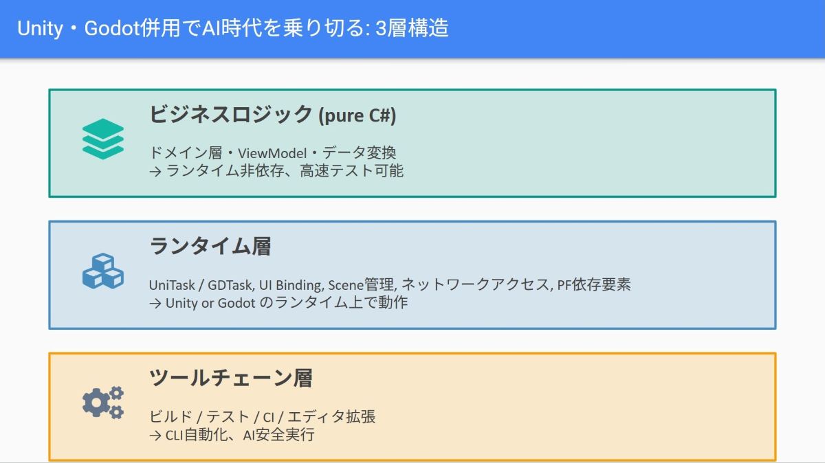「今日から仕事で使うGodot Engine」では、Unityのツールチェーンを補完する目的で一部Godot Engineを導入する手法が解説された(画像はスライド資料より引用)