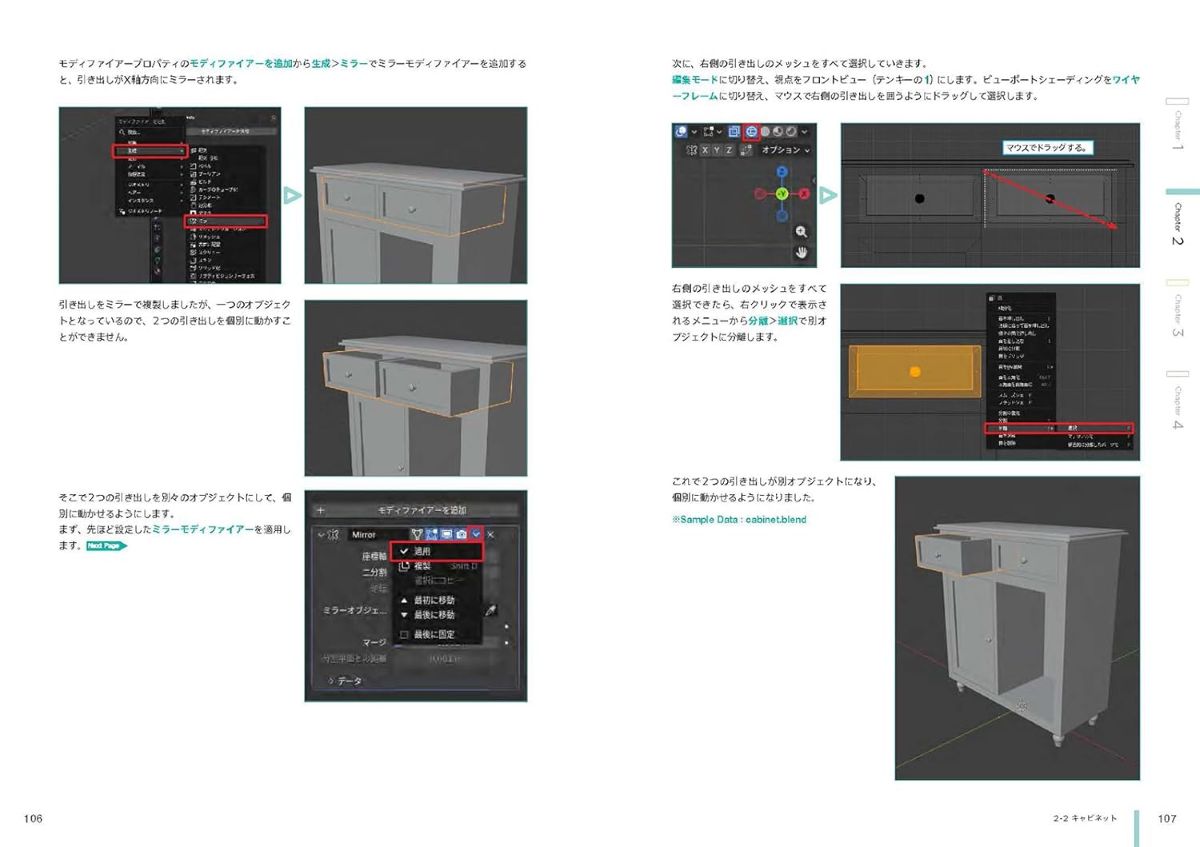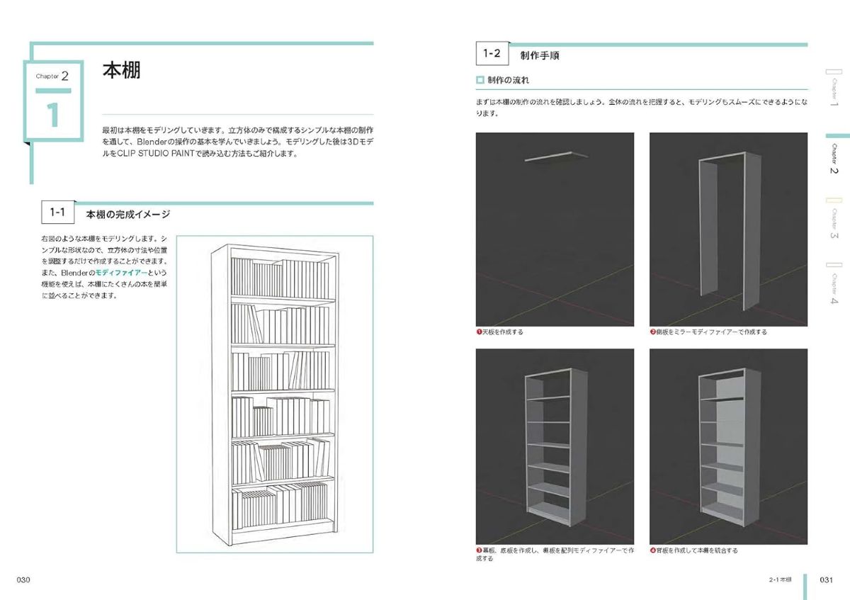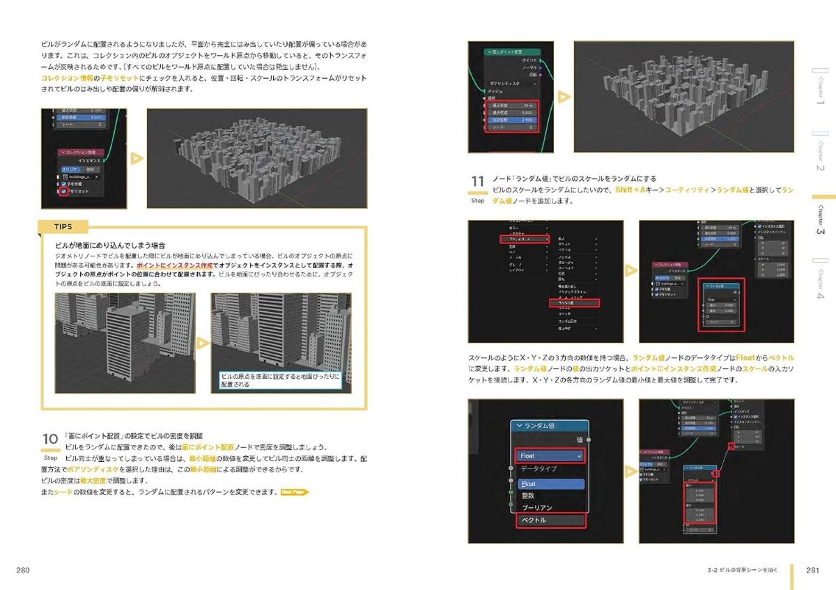 本棚やキャビネットなど具体的なモチーフを作る過程を通して実践的にモデリングの基礎を習得できるほか、オブジェクトの自動配置機能を用いたビル街の制作手法や、物理演算によって建物が破壊されるシーンを表現する方法といった応用テクニックも解説。